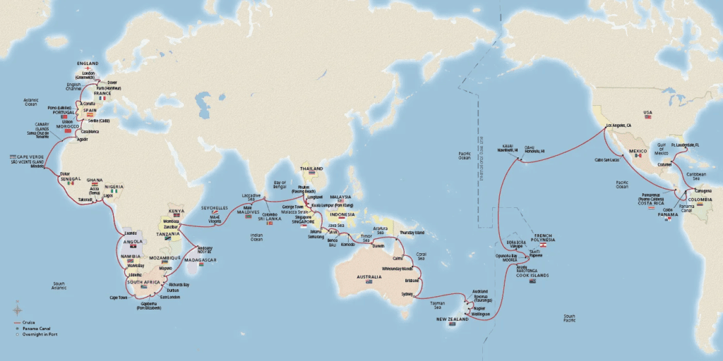Over 142 extraordinary days, this voyage traverses six continents and visits 62 captivating ports, including exotic destinations such as Tahiti, the Maldives and Zanzibar.