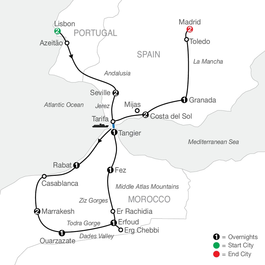 Embark on this gripping tour through the dramatic landscapes of Spain, Portugal, and Morocco. Moments destined to become memories abound as you stroll through Lisbon’s music-filled Alfama quarter, pick up the speed on a four-wheel drive tour in the Sahara, and slow it back down to catch some rays celebrity-style on Spain’s famous Costa del Sol. Keeping the plot line interesting, more action, adventure, and thrilling scenery await from the perpetual oasis of Marrakesh to the former sanctuary of Granada’s opulent Alhambra complex. With so many sights to gush over from Tangier to Toledo, it’s impossible to be “quiet on the set” on this tour of the Iberian Peninsula and Morocco.