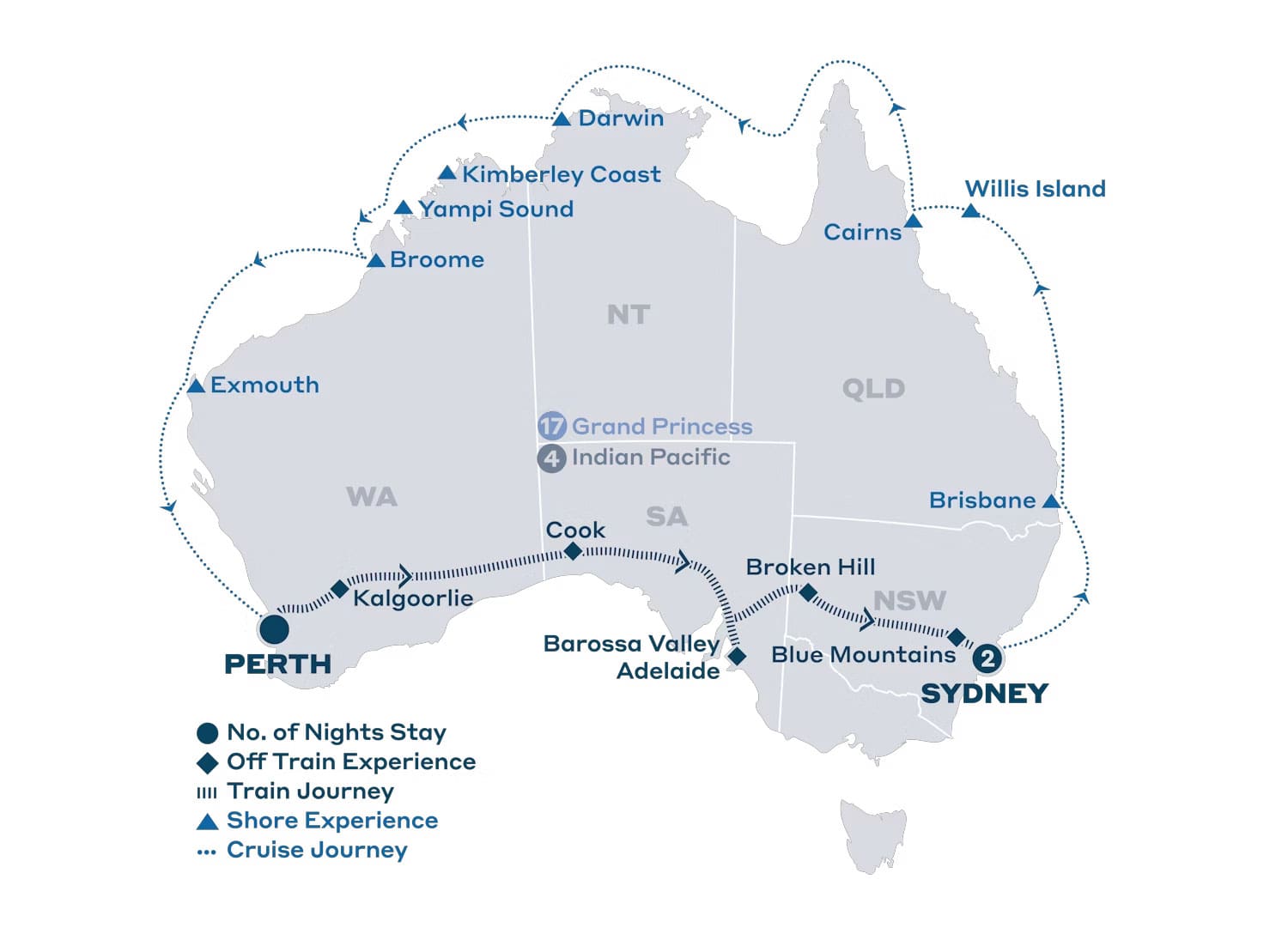 - Cruise Itinerary: Sydney, Brisbane, Willis Island, Cairns, Darwin, Kimberley coast, Yampi Sound, Broome, Exmouth and Perth (Fremantle), with optional shore excursions^