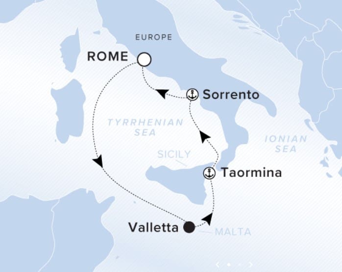 Cross the Tyrrhenian Sea from one UNESCO-listed capital to another as you embark in Rome and sail for Valletta, where a Caravaggio masterpiece is among the works displayed in the gilded interior of St. John’s Co-Cathedral. Then return to Italy to sip Sicilian wines and shop for handmade ceramics in Taormina before discovering the remarkable ruins of Pompeii and Herculaneum near Sorrento.