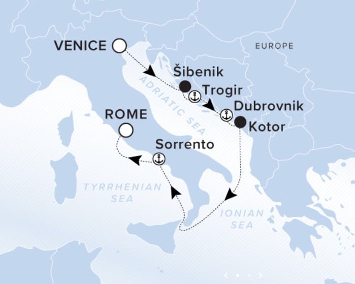 Every destination on this remarkable voyage features a UNESCO World Heritage site, from the visionary urban architecture of the Slovenian capital of Ljubljana to the Cathedral of St. James in Šibenik and the Old Towns of Trogir, Dubrovnik and Kotor. Italy offers the scenery of Mount Etna and the Amalfi Coast and the ruins of ancient Pompeii near Sorrento.