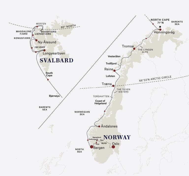 A scenic rail journey, all-inclusive cruise and expedition-style voyage, from Oslo to the High Arctic.