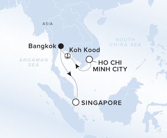 Journey from Vietnam with days spent relaxing in the tropical paradise of Koh Kood and exploring Thailand’s vibrant capital of Bangkok. An included overnight stay at a luxury hotel places you within walking distance of the ornate Wat Pho temple and the majestic spires of the Temple of the Emerald Buddha. Conclude with two leisurely days sailing in the sunshine before arriving to Singapore.