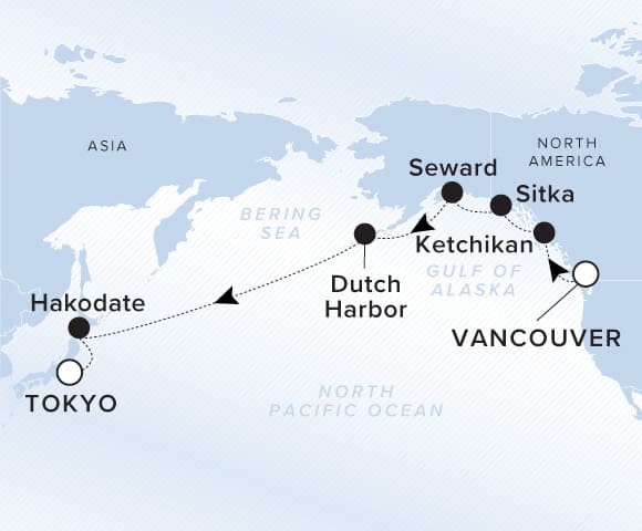 Cross the ocean and connect continents, first exploring landmark frontier towns in Alaska, from the historic boardwalk center of Ketchikan and totem poles of Sitka to Seward’s breathtaking glaciers and Dutch Harbor’s remote natural beauty. Arrive to Japan at Hakodate, on the northern island of Hokkaido, a culinary center ideal for savoring fresh seafood and regional specialties, including the rich milk, ice cream and cheese for which Hokkaido is known the world over.