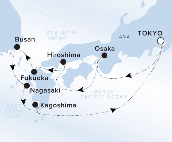 Explore Japan’s cultural and artistic heritage in the serene gardens, ancient temples and poignant peace memorials of Hiroshima and Nagasaki. Taste regional specialties and savor iconic dishes during visits to two of Japan’s culinary capitals — Osaka, with its Dotonbori street food district, and Fukuoka, the home of tonkotsu ramen. Along the way, call on South Korea to enjoy the modern spas and scenic coastal cityscape of Busan.